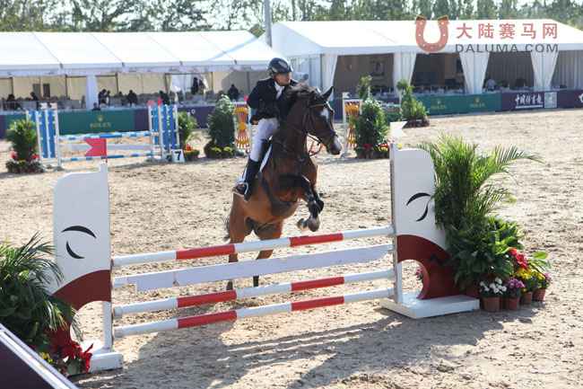 10月20日上午,2013国际马联FEI场地障碍世界杯中国联赛总决赛90-100cm青少年及马主赛第二轮9:00准时打响。比赛当天主办地朝阳公园沙排主场地迎来最好的天气,马主赛共有9位骑手参加,青少年赛有14位骑手参加。倒数第二位出场的来自京城马汇(北京)国际马术俱乐部的奇龙驰和马匹LUMINUS很遗憾的在倒数第二个障碍前,马匹靠的太近,被碰掉,总罚分4分,用时71.20秒。首轮奇龙驰0罚分第二名建立的优势也化为乌有,最终排名第六。