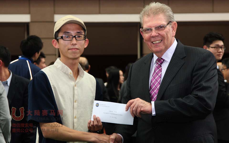 澳门赛马会首席受薪董事骆嘉谦先生赛前在马匹亮相圈,将二千元奖金颁予负责打理港澳杯最佳外观马匹“好健康”的马房助理。