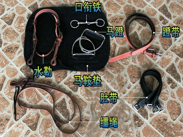 【配件】:含马鞍,马鞍垫,马镫,口衔铁,肚带,蹬带,水勒,缰绳。