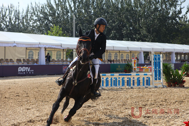 来自西坞乡村马术俱乐部的赵中和策骑CAMELOT以0罚分总用时56.57秒的好成绩获得青少年赛第一轮第一名