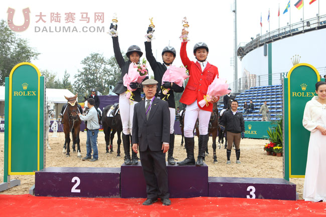 马主赛颁奖,冠军田雨,国发马术俱乐部的李哲和亚萨园马术俱乐部的范子欢分获二三名。