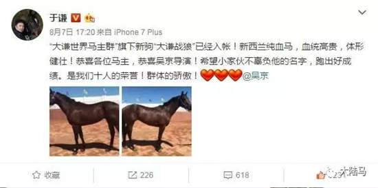 “大谦世界明星马主团体”的发起人、著名相声表演艺术家于谦老师不仅在《战狼2》里把配角“钱必达”演绎成了人人议论的亮点人物,还干了件“应景的正经事”——在对外宣布成立不到10天、购入三匹纯血赛马“大谦雄风”、“大谦雄捷”、“大谦雄鹰”之后,为庆贺《战狼2》票房突破30亿,新购入了一匹纯血赛马:“大谦战狼”。