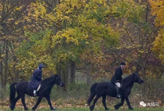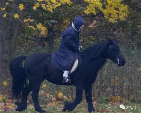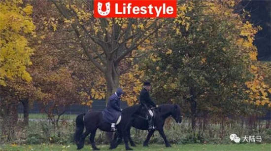 照片中,女王身着深蓝色长款雨衣,脚蹬深棕色马靴,骑着黑色爱驹漫步在落叶之间。女王不像往常那样戴着头盔,看上去更加放松,自如控制着身下的小马,显然她不会放弃和间断骑马这项她最喜欢的运动。