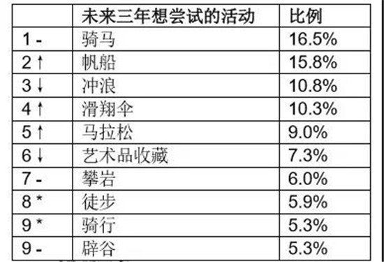 体验计划:帆船快速上升成为高净值人群未来三年最想尝试的第二大活动,骑马仍然第一,冲浪第三,滑翔伞上升一位到第四,马拉松再次进入前五,其他还有艺术品收藏、攀岩、徒步和骑行等。