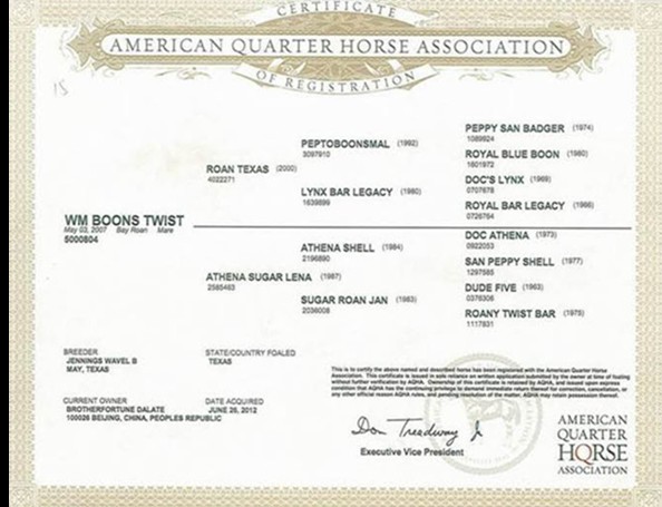 据拍卖项目负责人介绍,此次拍卖的名种马都具有美国夸特马协会颁发的身份登记证明,以及中国马术协会颁发的入境“护照”。