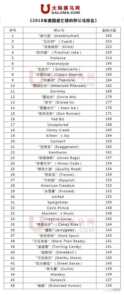 去年配种次数排名第三的“美国法老”,今年的排名也出现了下滑,2018年他的配种次数为182匹,排在了该榜单第十的位置。