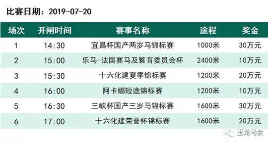 本比赛日可谓看点颇多,首场奖金30万元人民币的宜昌杯国产两岁马锦标赛1000米赛事,14匹国产两岁马列阵,吹响经典国产马大赛“中国马主联盟‘育马者杯’”前哨战;第三、六场赛事,2019玉龙春季拍卖会优秀毕业生“吉祥如意”、“星光大道”继续为荣誉而战;第五场三峡杯国产三岁马锦标赛1600米赛事,9战9捷的“汇通天下”将向10连冠发起冲击。另外,第二、四场,法国方面赞助的赛事,将上演7月大混战,5国赛驹将在比赛中展开激烈追逐。