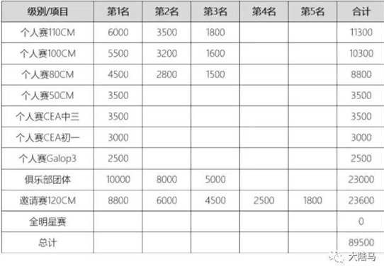 答:各级别比赛分别录取前5名;冠军颁发奖杯一座,冠亚季军骑手颁发奖牌,前五名马匹颁发佩花;各级别比赛前5名获得相应奖品。