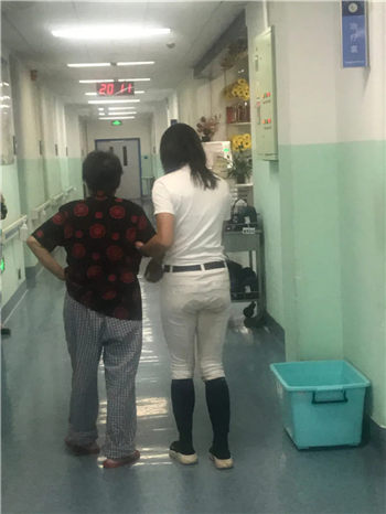 这张照片是在2018中国马术巡回赛居庸关长城站赛后,田雨和妈妈第一时间返回城区,赶回病房看望姥姥。