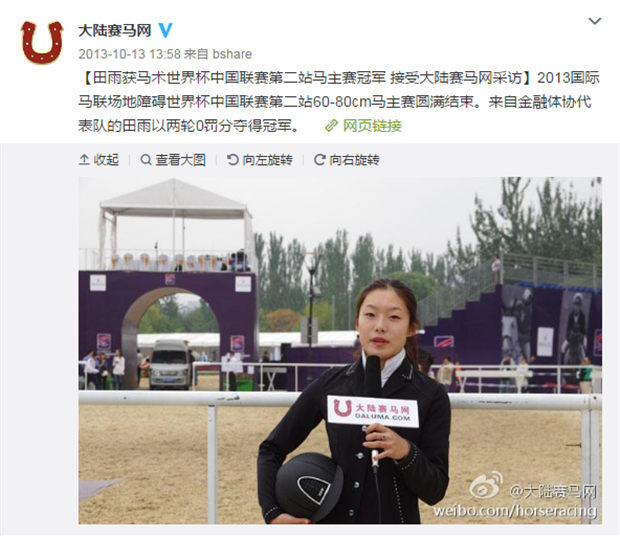连续多日采访田雨妈妈的大陆马记者,年龄与田雨相仿,在和田雨妈妈一起打开“田雨骑马20多年回忆之门”的过程中,不仅了解了一个在媒体聚光灯背后不为人知的那个韧劲十足、爱马如痴、青春靓丽的田雨,也被田雨妈妈20多年如一日的陪伴和付出深深打动。