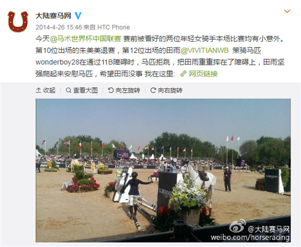 2014年,大陆马微博直播马术世界杯赛事。当时田雨不慎落马后,第一时间爬起来却去安慰马匹的场景,让很多人都非常感动。(注:当时马匹名字记录有误,这匹马不是“大弯”Wonderboy28,是一匹新搭档的马)