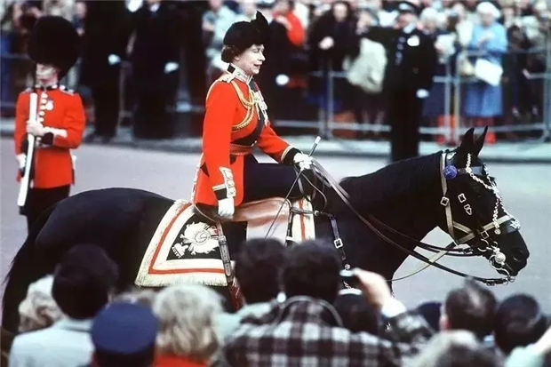 1987年以前,英女王伊丽莎白二世还是用侧鞍骑姿检阅部队,后来才改坐马车阅兵。