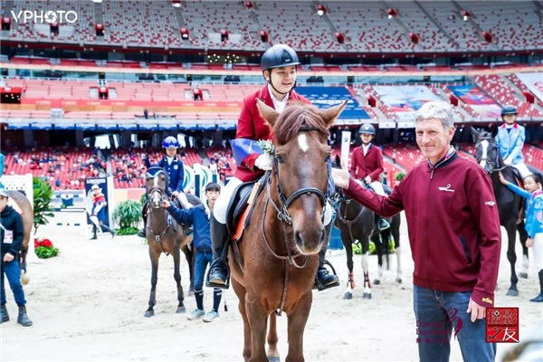 张硕策骑马匹“龙之锦”在50CM中小试身手,轻松拿到冠军。2019年10月,在被誉为国内马术骑手心中圣地的——鸟巢北京国际马术大师赛U14新星赛第一轮(80CM)比赛中,来自无锡阳山梦想马术学府年仅13岁的小骑手张硕在全国52对人马组合中脱颖而出,拿到含金量十足的亚军!