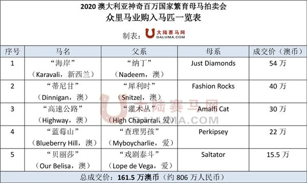 大陆赛马网讯 当地时间7月27日-29日,为期三天的澳大利亚神奇百万国家繁育母马拍卖会(2020 Magic Millions National Broodmare Sale)落下帷幕。此次拍卖会,玉龙马业成为最大买家,共斥资998.5万澳币(约5000万人民币)购入了15匹繁育母马。纯血马巨头库摩牧场则花费750万澳币(约3750万人民币)购入了三匹繁育母马,是此次拍卖会第二大买家。而近两年才布局赛马业的国内赛马新贵——众里马业也斥资161.5万澳币(约806万人民币)购入5匹怀孕母马,成为又一家进军澳洲赛马的中国马业企业。