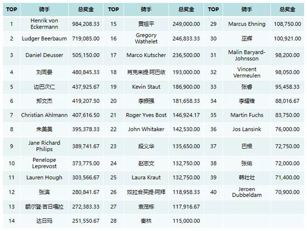 通过榜单我们可以看到国际骑手毫无悬念占据前三,像榜首的瑞典骑手Henrik von Eckermann,历时四年就创造了赢得近百万奖金的记录,几乎所有的国际职业骑手参加大师赛的行程都可以用个“快”字来形容:需要有限的时间里检查马匹、试马、热身、比赛,却依然能够夺奖项,这是对他们国际顶尖职业骑手身份最好的证明。来自德国的Daniel Deusser,仅仅参赛两年,就夺得了¥505150的奖金,位居榜单第三名,而他也是目前国内人气最高的国际骑手,实实在在的马圈“男神”。