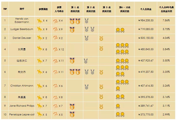 而另一面我们有四位国内骑手和国际骑手们平分秋色,跻身榜单前十。他们在9年里平均参加7届,平均每个人有10个人马组合、平均获奖8次,梅花香自苦寒来,不断的努力一定会有相应的回报。身为“中国队长”的刘同晏“刘大大”8年参赛,8年获奖,凭借稳定的发挥,用实力践行鸟巢是一个国内外顶尖骑手同台竞技的赛场。2019年,刘大大与他的队友们一起用实力赢得了宝贵的奥运入场券,作为奥运排行榜里位居国内骑手第一名的骑手,我们为他感到自豪,2021的东京奥运马术项目,我们期待他们为国增光。