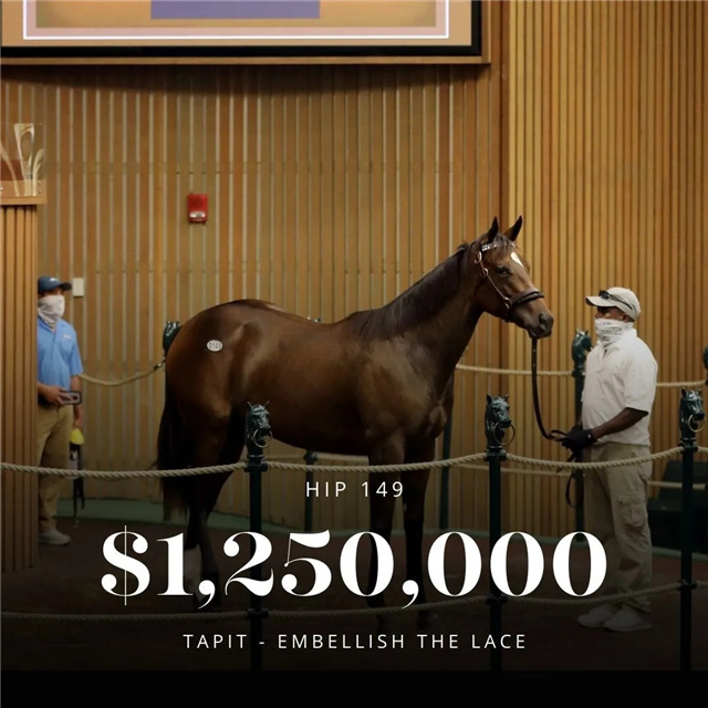 这匹拍卖编号149号的周岁雌马,父系是配种费常年位居北美地区前列的著名种公马“塔皮特”(Tapit),母系是肯塔基打吡冠军种公马“超值优惠”(Super Saver)的一级赛冠军女儿“花边装饰”(Embellish the Lace)。