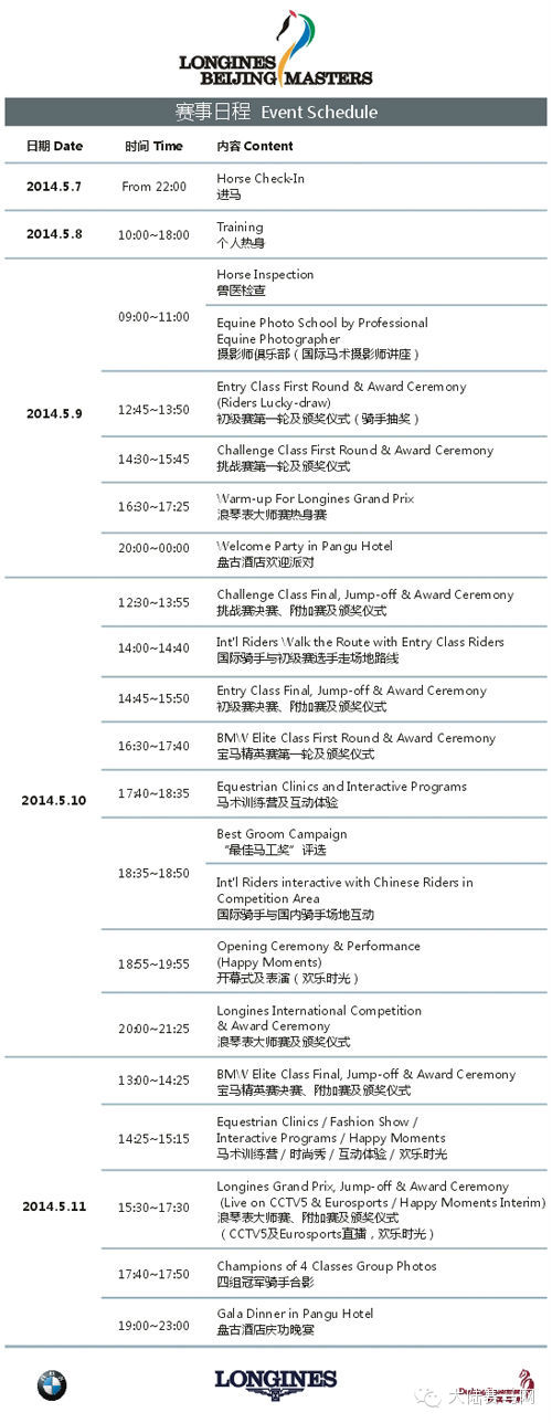 5月9日-11日,2014浪琴表北京国际马术大师赛将在国家体育场——鸟巢举行。这将是在中国首度举办的国际马联三星级(FEI CSI3)马术障碍赛,是目前为止中国马术障碍赛的最高级别。