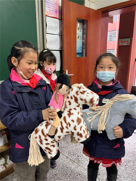 课余时间,小骑手们对玩偶爱不释手 (马术社团教具由青马体育官方合作伙伴“乐乐马”支持提供)