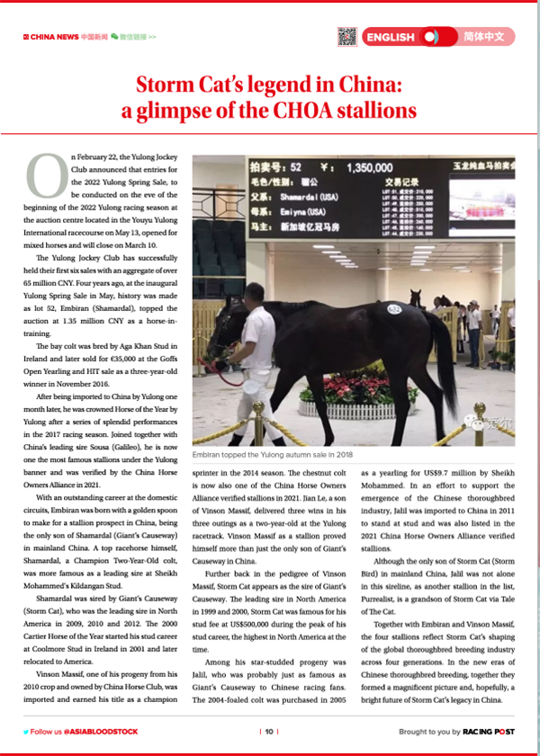 近日,国际著名行业媒体英国Racingpost(赛马邮报)旗下“亚洲赛马新闻”整版报道了中国马主联盟旗下认证种公马专题文章: