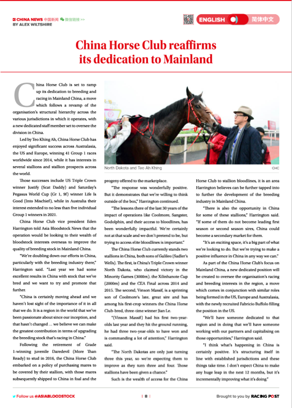 近日,国际著名行业媒体英国Racingpost(赛马邮报)旗下赛马媒体亚洲赛马新闻近期对CHC杰士马主俱乐部副总裁伊登·哈灵顿(Eden Harrington)进行专访并做出整版报道——