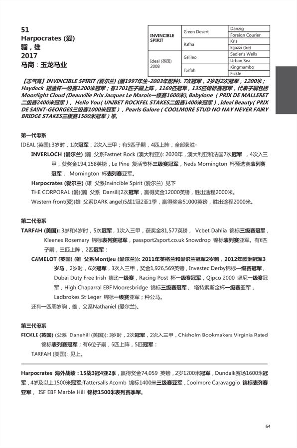 LOT51 Harpocrates(公马,父系“志气高”,母系“伽利略”女儿Ideal),已拿到过三场比赛冠军。
