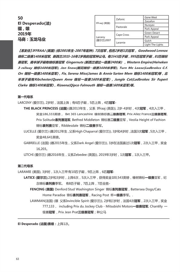 LOT50 的El Desperado(父系“易发佳”Ifraaj;母系Larceny),出生于2019年,父系是著名的英国穿梭种公马“易发佳”(Ifraaj),21岁的他也是一匹常青藤种公马;母系是爱尔兰种公马“十字弯角”(Cape Cross)的女儿Larceny,而他自己却是出生于法国。
