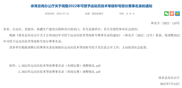 近日,国家体育总局发布《体育总局办公厅关于调整2022年可授予运动员技术等级称号部分赛事名录的通知》(下文称《通知》)。