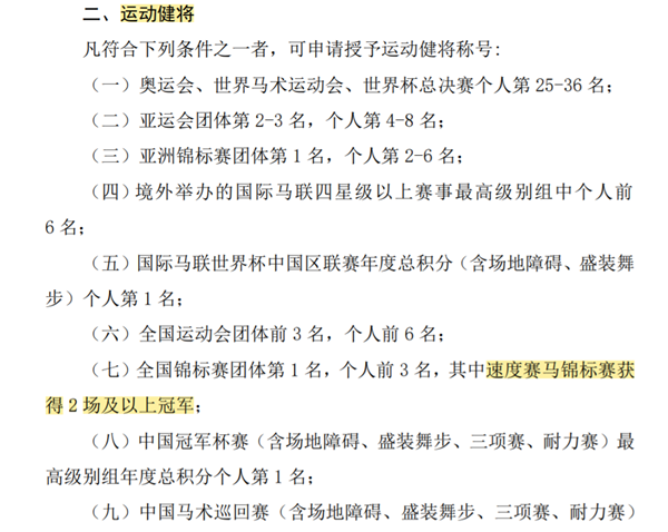 “马术运动员技术等级”共分为5等,最高的是“国际级运动健将”,需参加国际级别赛事,并取得优异的成绩;第二档就是“运动健将”,速度赛马骑手只要拿下全国速度赛马锦标赛2场及以上头马即可申请。