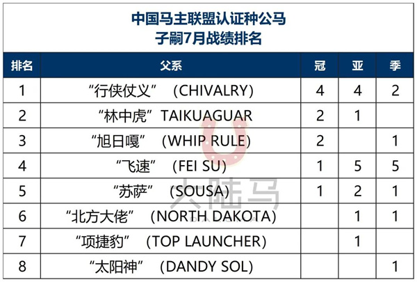 7月排行榜首位的是,玉龙马业中国马主联盟认证种公马“行侠仗义”(CHIVALRY,父系 “街头口号”Street Cry,母系World Peace),其子嗣斩获了4冠4亚2季的佳绩。