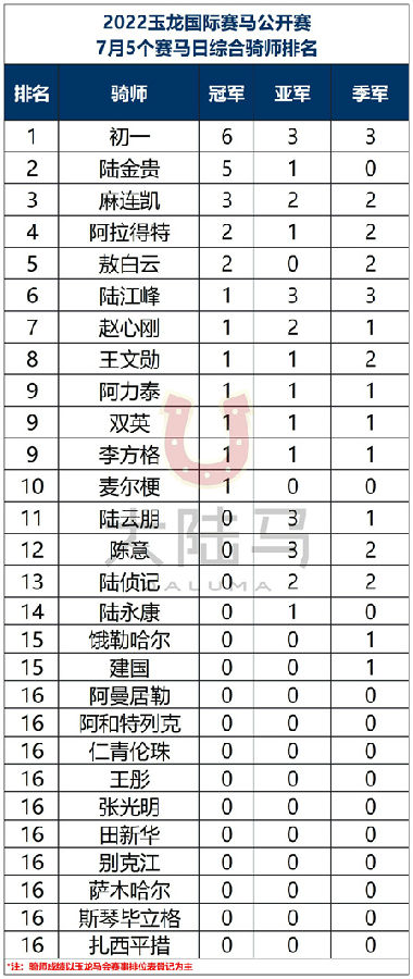 以上为2022玉龙国际赛马公开赛7月5个赛事日的成绩统计,下场比赛将于明日(8月6日)如期开展。