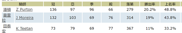 骑师麻连凯则以3冠2亚2季,位居第三位。
