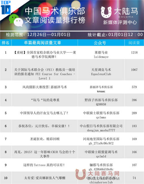 中国马术俱乐部文章阅读量排行榜第四期榜单