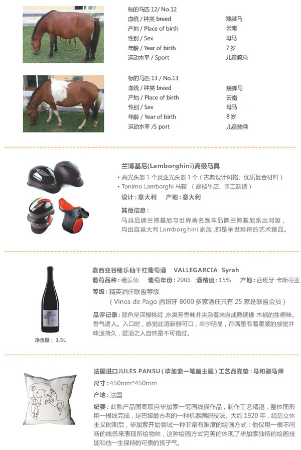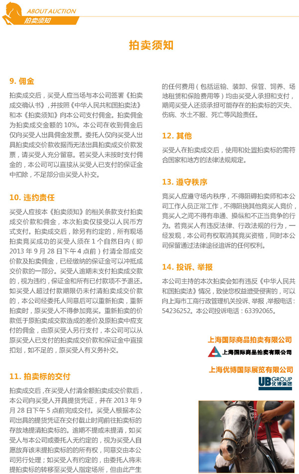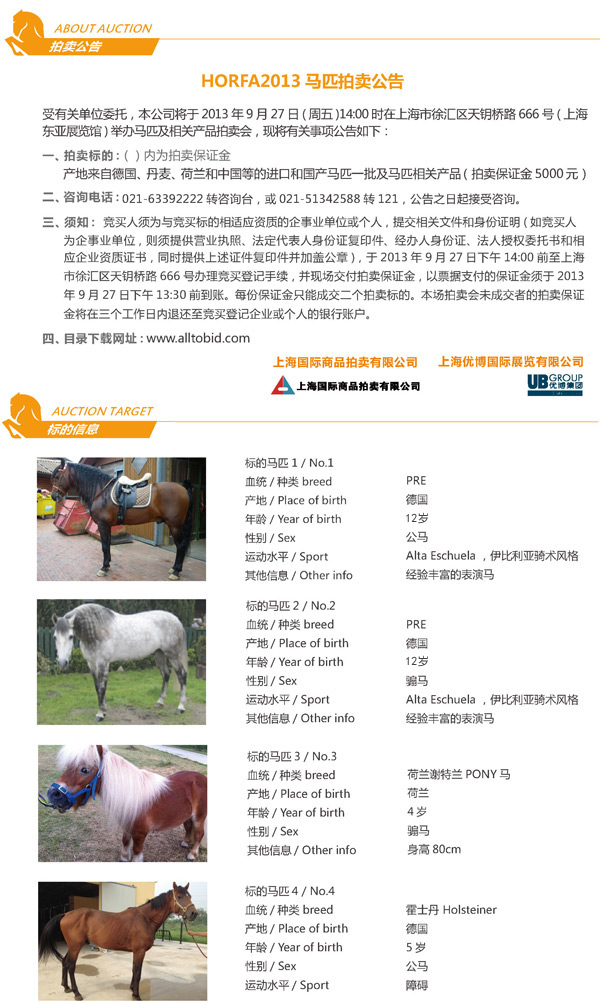 9月27日,作为2013第四届HORFA中国(上海)国际马业展览会(马博会)的一个推陈出新的重要部分。上海国拍将第一次拍卖包括马匹在内的活体拍品,该场拍卖会将是国内拍卖行业最大规模的马匹拍卖。拍卖活动27日下午2点在上海市徐汇区天钥桥路666号东亚展览馆举行。详情如下:
