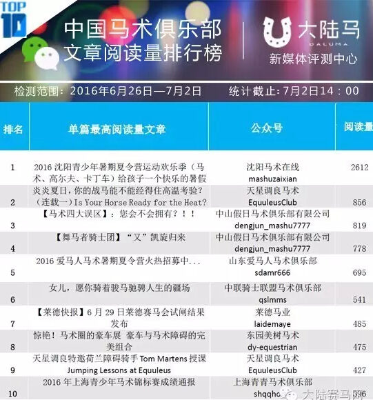 中国马术俱乐部微信影响力排行榜TOP10|7.4第30周