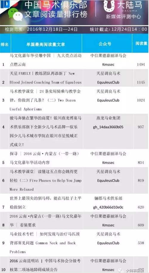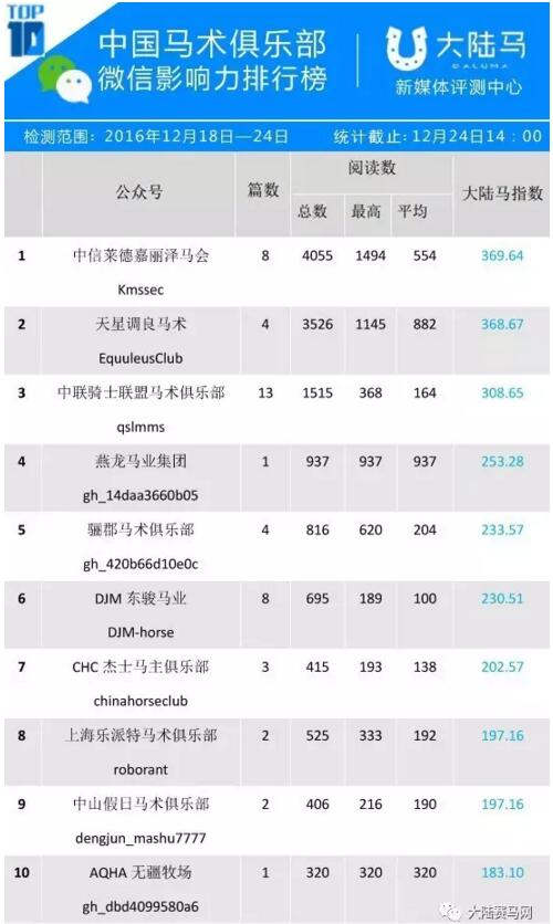 每期榜单由大陆马新媒体数据评测中心编制,依据各俱乐部微信数据、大陆赛马网PC端网站、大陆马APP、大陆赛马网微信、微博、搜索引擎(百度&谷歌)的搜索指数等客观数据以及产生的社会影响力、知名度综合评判,推出《中国马术俱乐部微信影响力排行榜》及《微信单篇阅读量最高文章》排名的榜单。力求助力马术俱乐部经营者们在“互联网+体育”的潮流下共同为俱乐部的业务提升探索新方向。