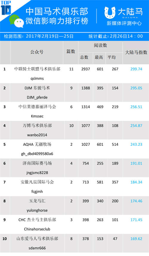 每期榜单由大陆马新媒体数据评测中心编制,依据各俱乐部微信数据、大陆赛马网PC端网站、大陆马APP、大陆赛马网微信、微博、搜索引擎(百度&谷歌)的搜索指数等客观数据以及产生的社会影响力、知名度综合评判,推出《中国马术俱乐部微信影响力排行榜》及《微信单篇阅读量最高文章》排名的榜单。力求助力马术俱乐部经营者们在“互联网+体育”的潮流下共同为俱乐部的业务提升探索新方向。
