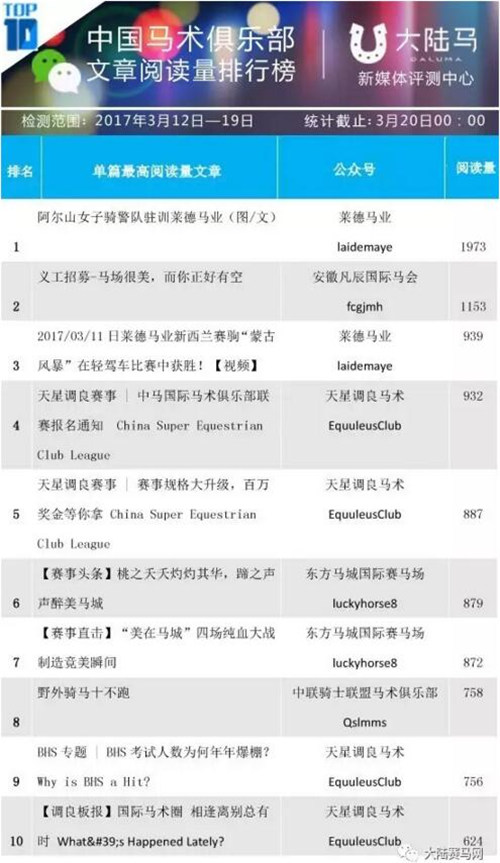 中国马术俱乐部文章阅读量排行榜总第65期榜单