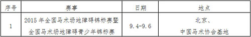 根据2015年全国马术项目赛事计划,现对2015年全国马术场地障碍锦标赛暨全国马术场地障碍青少年锦标赛有关赛事时间和地点通知如下: