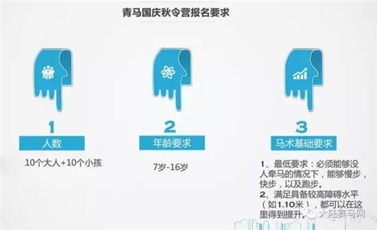 报名2017青马国庆秋令营的孩子和家长均可参加10月12日“青马乐园鸟巢年度总决赛”,与全国的青少年和家长同场尽享欢乐马术趣味赛事;