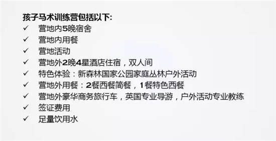 下午家长陪送孩子办理入营手续后,孩子们在马术训练营晚餐和休息。家长前往欢迎晚宴,并入住附近英式庄园酒店休息。
