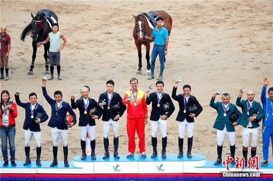 当天第十三届全运会马术项目比赛在天津环亚马球公园拉开战幕,最终广东队夺得团体冠军。图为颁奖仪式。