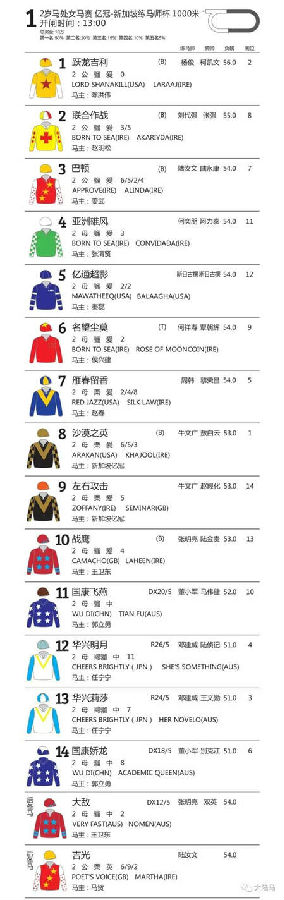 13:00 第一场 2岁马处女马赛 亿冠-新加坡练马师杯 1000米;