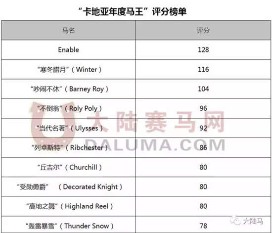 在近日公布的第二十七届年度卡地亚赛马奖(27th annual Cartier Racing Awards)“2017年卡地亚年度马王”的评分榜单中,三岁马Enable以128分位居榜首,颁奖典礼将在11月14日晚于英国伦敦的多切斯特酒店举行。