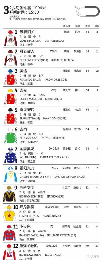15:50 第三场 2岁马条件赛 1000米;