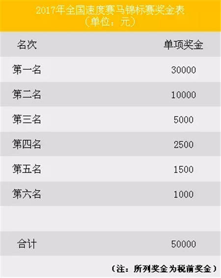 2017全国速度赛马锦标赛是中国马术协会主办,武汉市体育局承办的国内最高级别速度赛马赛事,将于2017赛马节的第二个赛事日——29日在武汉东方马城赛马场举行。全国速度赛马锦标赛已是连续第9年、第11次在武汉举办,参赛单位是国家体育总局马术项目2017年度注册代表单位以及中国马术协会注册的会员,共设置6个竞赛项目,竞赛项目包括:2岁马组1000米、3岁马组1000米、3岁马组2000米、4岁以上马组1000米、2000米、3000米。6项赛事总奖金为30万元人民币,单场奖金5万元,头马奖金3万元。
