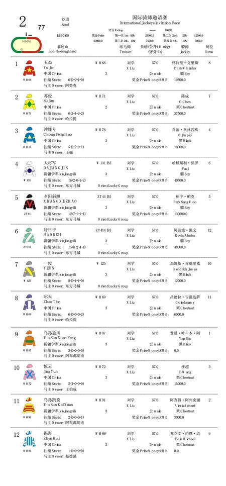 “武汉杯”国际骑师邀请赛,是武汉国际赛马节经典传统赛事,今年邀请了来自法国、英国、爱尔兰、澳大利亚、新西兰、韩国、马来西亚、菲律宾、塞浦路斯、毛里求斯等十个国家的十名骑手参赛,连同二名中国的优秀骑手,将策骑伊犁马出战1000米短途赛事。