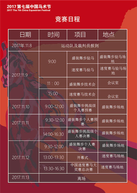 今年的比赛项目分为2017年中国马术节盛装舞步赛和2017年中国速度赛马大奖赛总决赛。大赛由中国马术协会、四川省体育局、成都市人民政府主办,成都市体育局、成都市温江区人民政府承办,新浪四川作为本届中国马术节赛事指定合作伙伴和唯一商业运营推广单位。
