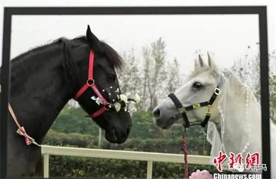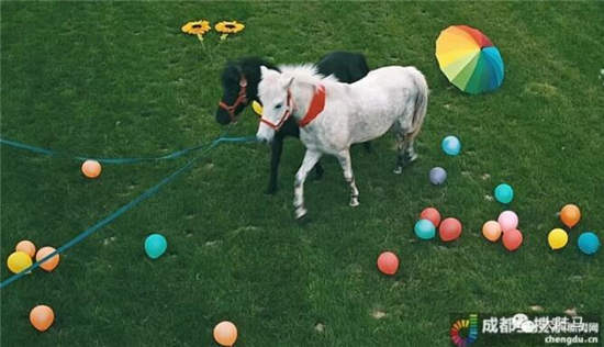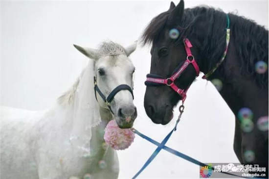 戴着领结的黑马叼着玫瑰,送给披着婚纱的白马。约定俗成的“白马王子”在这里变成“白马公主”,而“王子”则化身黑马。照片中,“黑马王子”和“白马公主”悠闲地踱步,在肥皂泡、玫瑰花、青草地、彩色气球营造的浪漫氛围中时刻耳鬓厮磨……