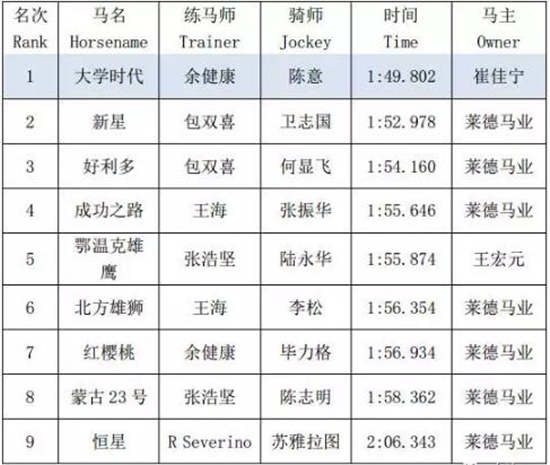 闸门打开后,4号马“王者荣耀”领放,其余8匹马的速度比较平均,转过弯道后,“大谦雄风”和“大谦雄鹰”暂列第二梯队,第二个弯道“大谦雄鹰”追赶至第一梯队,与“王者荣耀”并驾齐驱。在最后150米的紧要关头,所有马匹开始加鞭,最终陆永华策骑“大谦雄鹰”以一个马位的优势率先冲过终点,紧随其后的是3号马“东北大地”和5号马“大谦雄风”,骑师分别为黎加飞和陆江峰。